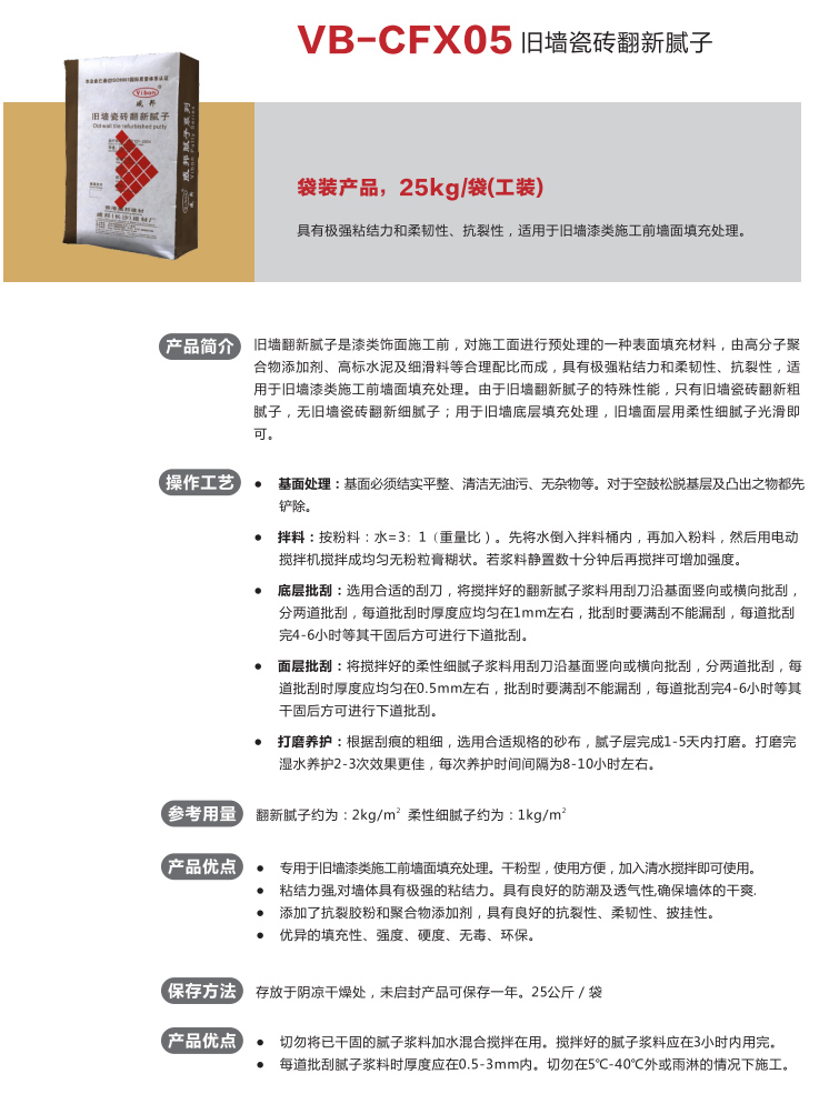 专用于旧墙漆类施工前墙填充处理。干粉型,使用方便,加入清水搅拌即可使用。