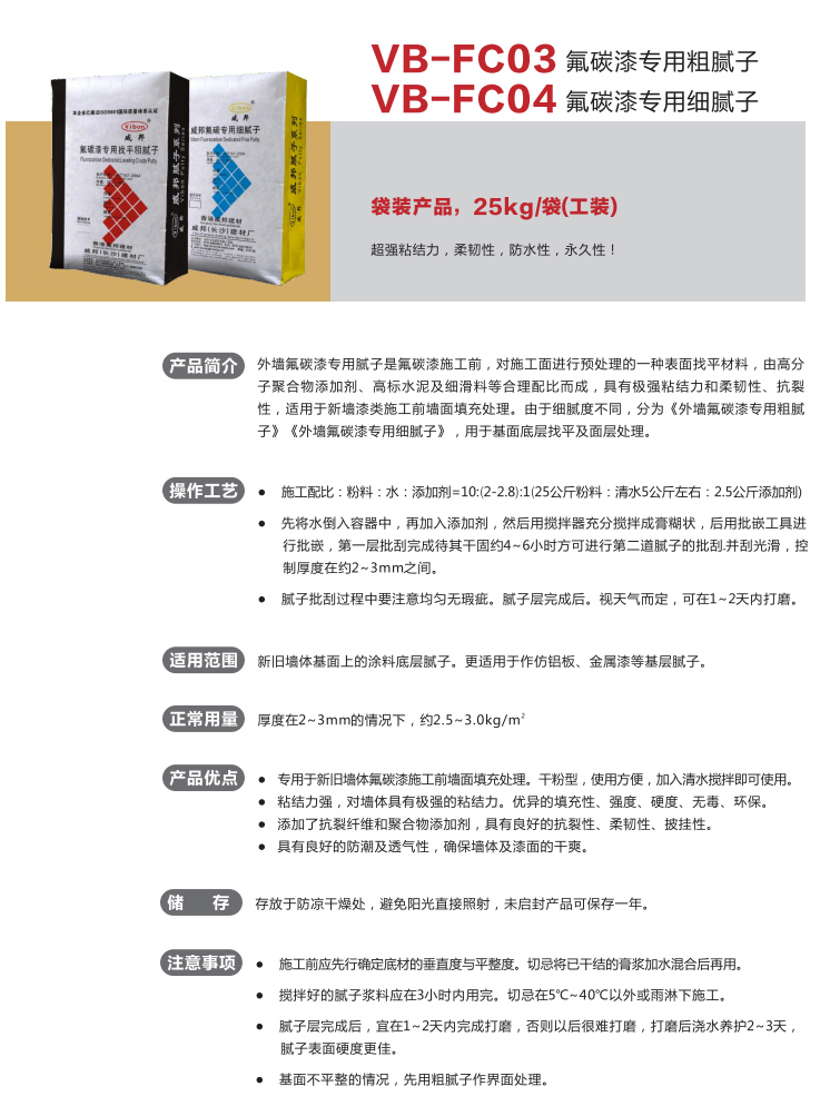 专用于新旧墙体氟碳漆施工前墙面填充处理。干粉型,使用方便,加入清水搅拌即可使用。